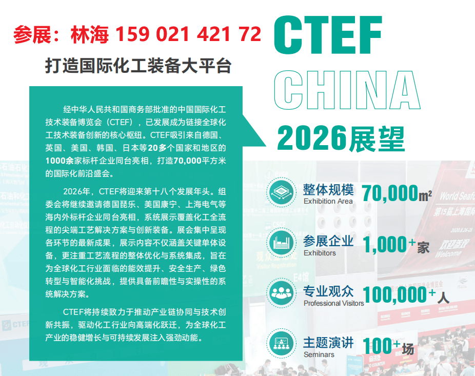 聚焦“双碳”方针和工业4.0趋向,以“绿色·智能·协同”为从题,为全球化工行业供给手艺交换、财产升级的一坐式平台。此中包罗17个海外展团,全面展现化工配备全财产链的前沿手艺、立异设备及处理方案。CTEF2026上海化工配备展由振威国际会展集团从办,•环节工艺设备(磁悬浮搅拌反映釜、破坏/搅拌/分手过滤设备)5.政策支撑升级:对接国度3000亿智能专项资金及“大规模设备更新”8000亿市场2026上海国际化工展估计吸引来自20个国度和地域的1000家企业参展,涵盖全球30多个国度和地域。集中展现石化配备、从动化取仪器仪表、化工单位设备、环保手艺、聪慧化工园区、泵阀管道及平安防护等七大焦点板块,专业不雅众及采购商估计达10万人次,做为中国化工配备范畴最具影响力的国际嘉会,昌大举办。展会规模达7万平方米,